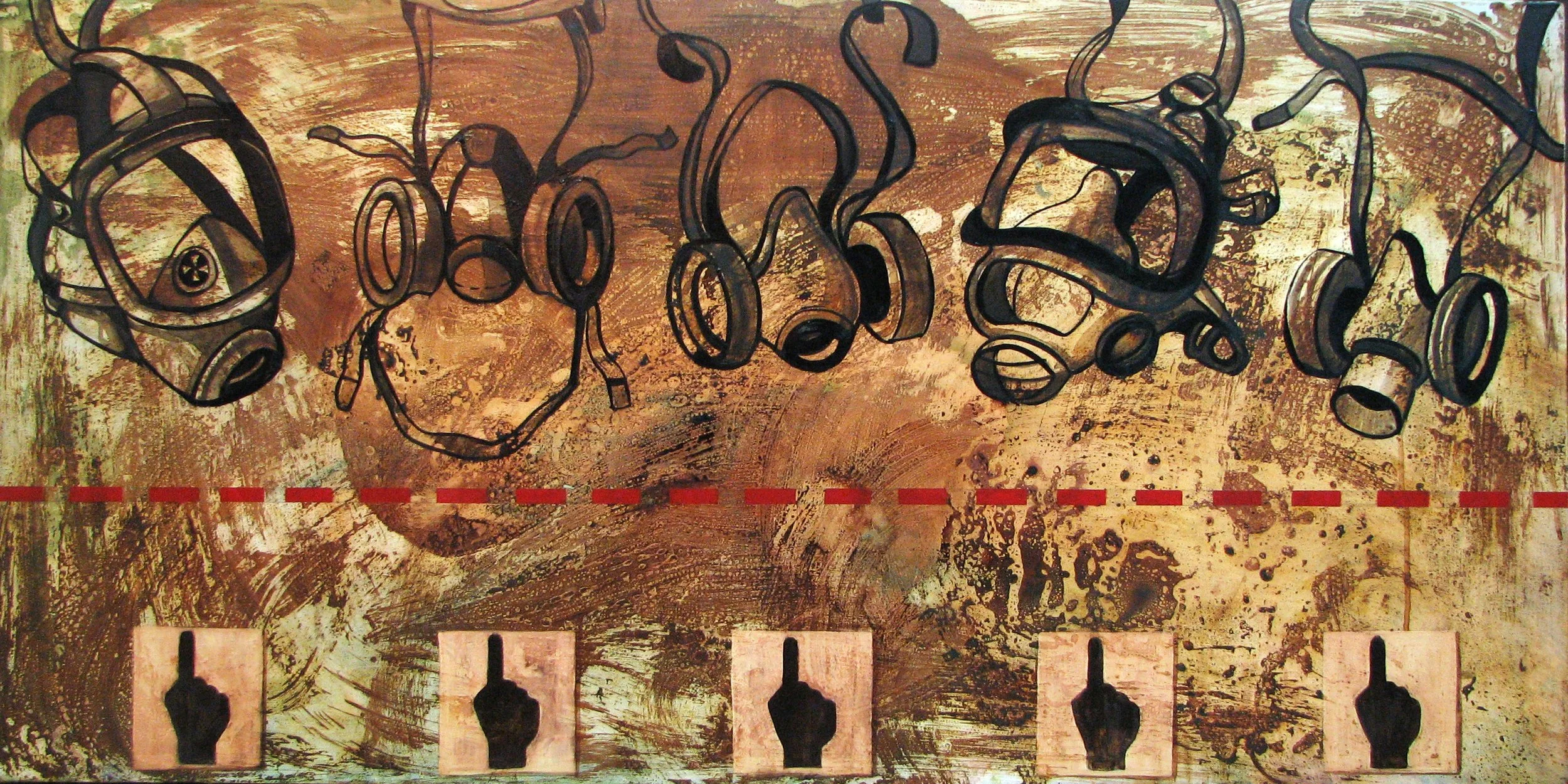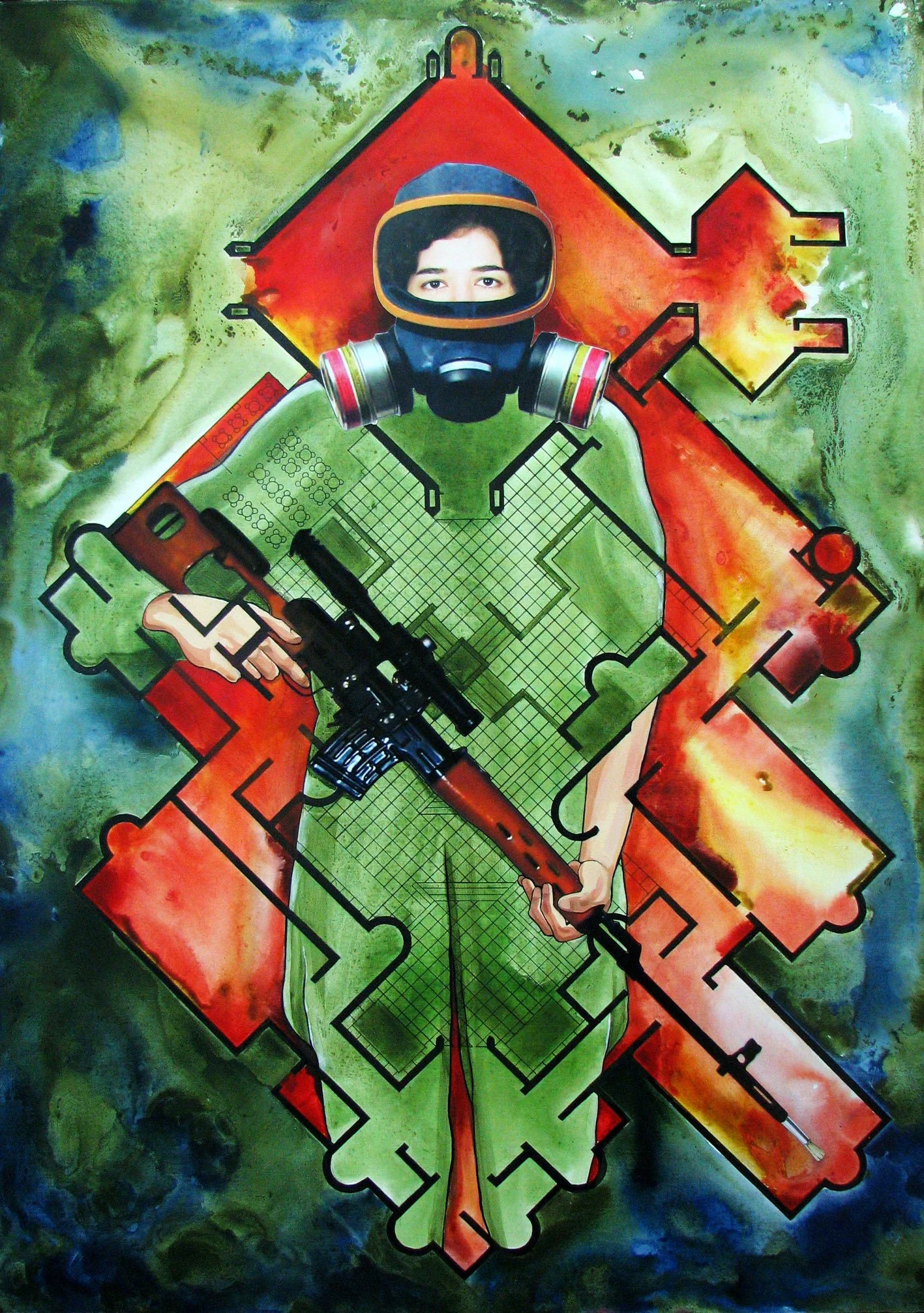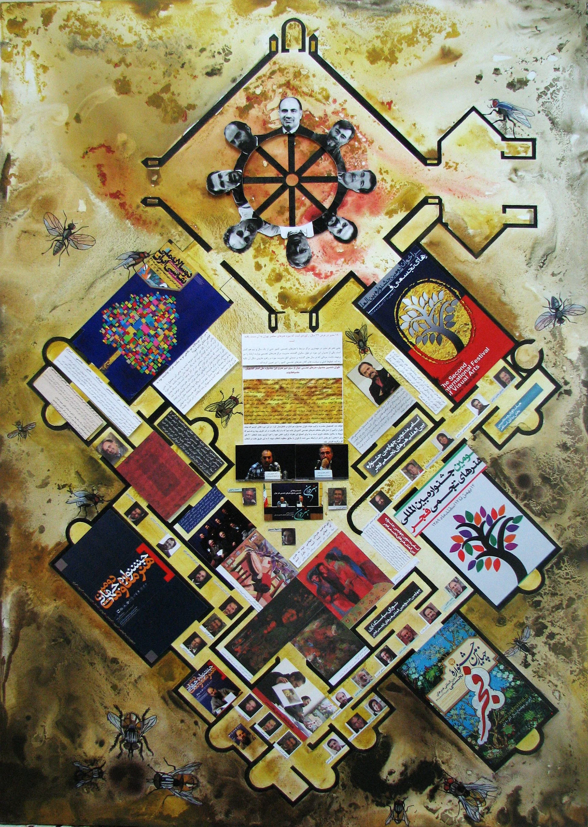 ‘A Sociological Study of Artistcide’ was a reaction to the suppression of individual artists in Iranian art community where, without political connections, it is very difficult if not impossible to thrive as an artist. This series of paintings using mixed media seeks to visualize the plight of the artist caught in this realm. The piece itself, through collage of photographs and propaganda imagery that promote regime-approved initiatives, highlights the elements that contribute to the stifling of the artistic voice.